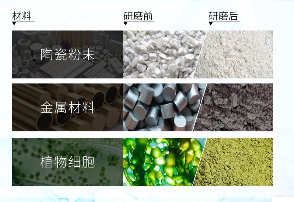 它广泛应用于水泥,硅酸盐制品,新型建筑材料、耐火材料、材料化学实验室,生物化肥与有色金属选矿以及玻璃陶瓷等生产行业,对各种矿石和其它可磨性物料进行干式或湿式混合。广泛应用于电子、陶瓷、涂料、玻璃粉、荧光材料、非金属矿、医药、电子材料、磁性材料、装备电池、生物培育、食品包装、电池材料等进行加工的过程中研磨和混合。